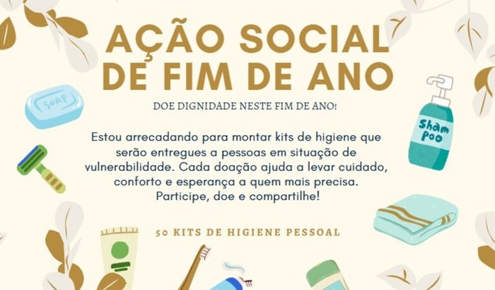 Doe dignidade neste fim de ano – Kits de Higiene para quem mais precisaNeste fim de ano, queremos espalhar amor, cuidado e dignidade.Estamos organizando uma ação solidária para montar kits de higiene que serão entregues a pessoas em situação de vulnerabilidade.