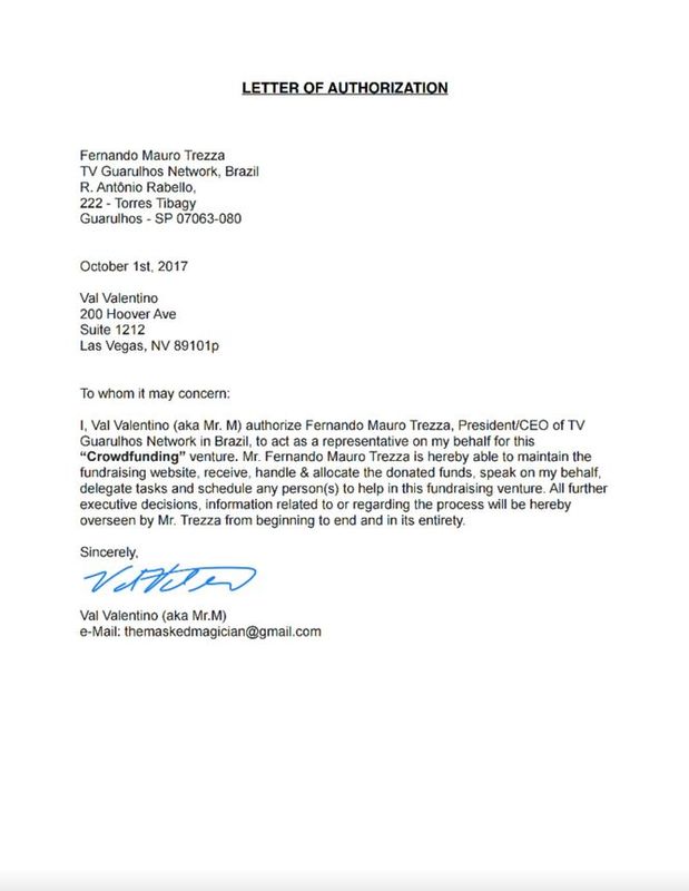 Abaixo está uma carta do nosso amigo Mister M, autorizando o coordenador da campanha, Fernando Mauro Trezza, a supervisionar a arrecadação dos recursos financeiros necessários para o bem-estar e cura do nosso ídolo.