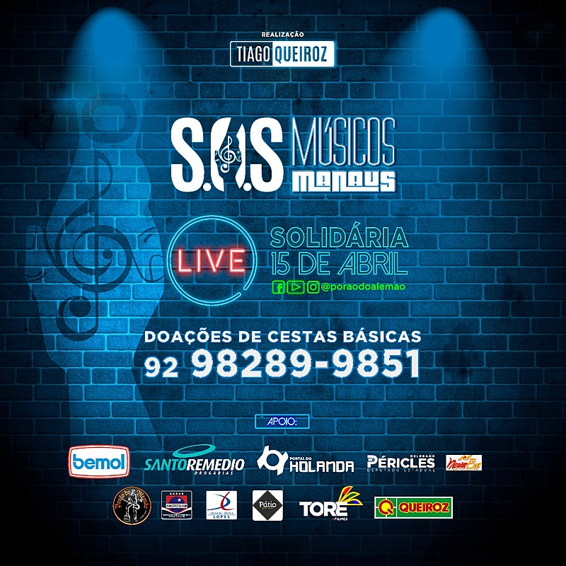 *Músico realiza live solidária para ajudar colegas prejudicados com o Coronavírus* O músico e funcionário público Tiago Queiroz, 36, realizará a live SOS Músicos Manaus para ajudar, mediante a doação de cestas básicas, os profissionais da música que foram prejudicados com a crise decorrente da pandemia gerada pelo Coronavírus. O Ao Vivo acontecerá na próxima quarta-feira (15), às 19h, e será transmitido pelas redes sociais do Porão do Alemão. Os cantores Nicolas Júnior, Jyou Guerra e Humberto Amorim, o trio formado por Thiago Carvalho, Carol Garcia e Vinícius Machado, bem como as bandas Ravox, Fullgas e Hightower já confirmaram participação na live. Durante a transmissão, haverá Jazz com Humberto Amorim acompanhado do pianista César Serafim, as célebres composições de Nicolas Jr., o sertanejo Jyou Guerra, os especiais Barão Vermelho e Charlie Brown Jr., além de muito rock and roll com Hightower e Thiago Carvalho. Tiago relatou que muitos músicos sobrevivem apenas dos cachês provenientes de apresentações em bares, restaurantes e casas noturnas, e que as pessoas poderão ajudar por meio de transferência bancária. "Muito se fala sobre música, mas poucos pensam naqueles que fazem a música. Que realmente nos emocionam fazendo rir e chorar. Poucos pensam no músico, eles também têm família para sustentar. De um modo geral, são mal remunerados. Mais do que nunca é hora de ajudá-los.” enfatizou. Como precaução contra o Covid19, os músicos farão um revezamento no palco e deixarão o local do evento após suas apresentações, a fim de evitar aglomerações. Vale ressaltar que o palco será sanitizado, e não haverá platéia. Entre os apoiadores estão Bemol, Santo Remédio, Anoreg/AM, além do Porão do Alemão e do deputado Delegado Péricles.