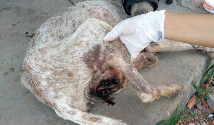 Vitória é uma cadela que se encontra muito debilitada por conta de possuir o membro posterior direito afetado por miíase. Não sabemos ao certo o valor do tratamento, mas desde já pedimos a sua ajuda, aceitamos qualquer valor.