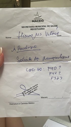 Eu sou Thicianne maria , tenho 16. Estou criando essa vaquinha porque preciso muito da ajuda de vocês para realizar uma avaliação neuropsicológica. Recentemente fui encaminhada ao psiquiatra com suspeita diagnóstica de F90, F41 e F32, e para entender melhor o que realmente acontece comigo, é necessário passar por essa avaliação completa. Ela é essencial para trazer respostas, ajudar no diagnóstico correto e direcionar o tratamento adequado. Infelizmente, essa avaliação não é oferecida pelo SUS, e o valor total é R$ 1.950, um custo que no momento eu não consigo arcar sozinha.