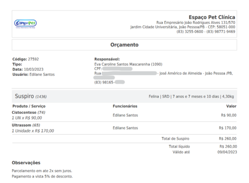 Orçamento dos exames.