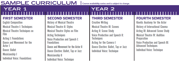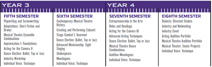 O Bacharelado em Finas Artes: Teatro Musical, da American Musical and Dramatic Academy (AMDA), para o qual apliquei e obtive aprovação, é uma graduação que atende a estes pontos elementares para a formação do ator-cantor e dançarino de teatro musical. No currículo simplificado do curso (figura 1; figura 2), podemos observar disciplinas de, pelo menos, três linguagens artísticas (teatro, música e dança) durante todos os semestres da graduação. À introdução, é notória a coexistência de técnicas distintas, o que torna possível atentar à diversidade cultural como uma patente característica. Há ainda as disciplinas eletivas, que, somadas às linguagens artísticas desenvolvidas e à diversidade cultural, evidencia uma formação pessoal e singular, que “combina uma educação universitária abrangente com um rigoroso treinamento artístico em a nível de conservatório que enfatiza a maturidade criativa, a profundidade estilística e a excelência profissional” (AMDA Guide Book, pág. 14).