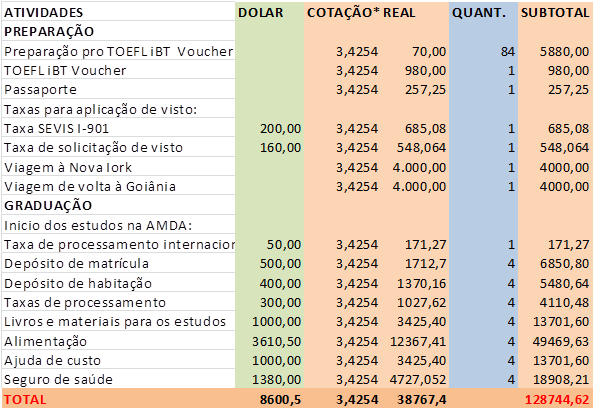 - a alimentação, para a modalidade do campus duplo, o custo é a resultante da média dos valores anuais somados, disponibilizados na Family Budget Calculator do Economic Policy Institute’s.