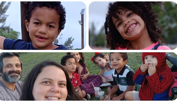 Nossos gêmeos José Hélio e Maria Rebeca, de 7 anos, tornaram-se nossos filhos pela via da adoção junto com seu irmão menor José Caio de 6 anos. Nós, Leandro meu esposo e eu, já tínhamos dois filhos pela via biológica a Maria Isabel (5 anos) ver tudo