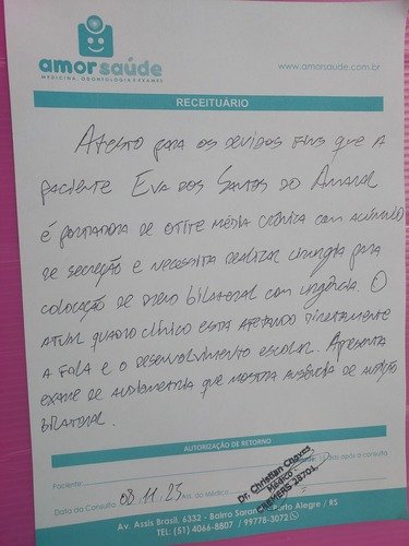 Infelizmente há uns 3 meses atrás descobrimos que a Eva tem uma otite crônica e que seus ouvidos estão com um líquido no qual está impedindo ela de ouvir direito e falar,ela precisa fazer uma cirurgia com urgência pra colocar um dreno no ouvidinho dela,essa cirurgia custa 7mil e nós não temos condições,já tentamos pelo SUS,mas não conseguimos nem a consulta com o otorrino,tentamos judicial mas não tivemos retorno ainda e eu como mãe não posso ficar de braços cruzados,peço de coração quem puder nos ajudar,com qualquer valor será muito bem vindo,que Deus abençoe cada um de vocês ❤️ compartilhem muito🙏
