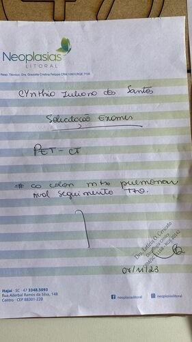 Sou Cynthia Juliana,estou arrecadando o valor para está realizando um exame de alto custo , aproximadamente $6.000,00 chamado pet scan,esse valor também ajudará com todo o meu transporte,pois é em outra cidade,estou nessa batalha a 4 anos em tratamento…abaixo está a solicitação do exame pedido pela minha médica oncologista, conforme o resultado do exame,estaremos iniciando um novo tratamento…