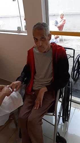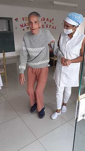 Quando ele entrou na clínica ele estava pesando 39 kg, e hoje ele já se encontra com 56 kg, começando a dar uns passos. Junto a isso ele teve a troca da medicação, a qual estava causando anemia. Também está obtendo uma melhora significativa.