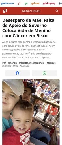 Meu nome é Laura, e meu filho Gabriel, de 5 anos, tá com um câncer chamado linfoma de Burkitt. Esse tipo de câncer é muito agressivo e raro, e se espalha rápido demais. Nós não temos dinheiro pra pagar o tratamento urgente que ele precisa, ver tudo