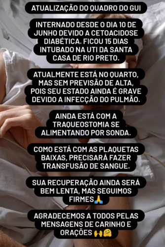 Como todos sabem, nosso querido DJ Gui Scochi está internado na Santa Casa de Rio Preto por complicações da diabetes. Saiu da UTI, mas ainda seu estado é crítico e requer muitos cuidados. Está respirando pelo tubo da traqueostomia, se alimentando pela sonda e como precisa de um profissional da saúde o tempo todo, criamos essa vaquinha para nos ajudar com os custos de enfermeiros extras e compras de medicamentos e materiais necessários. Estimamos uma previsão de 1 mês de enfermeiros e materiais no valor de R$6.000,00, durante estiver no hospital, podendo ficar mais tempo.