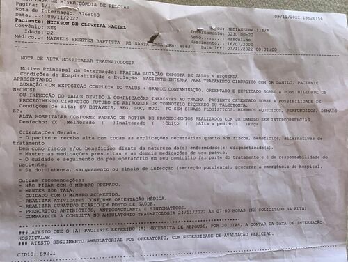 Olá amigos, venho através desta vaquinha pedir ajuda, sofri um acidente no dia 06.11.2022 onde um carro cortou minha preferencial e acabei tendo uma fratura exposta no tornozelo esquerdo. Hoje 24.11.2022 data do meu retorno a traumatologia da santa casa tive o diagnóstico de grande risco de perder o movimento do pé e precisarei fazer tratamento onde o custo com remédios será bem alto, além de também ter que fazer fisioterapia que terá outro alto custo, infelizmente quem causou o acidente simplesmente não arcou com nenhum dos custos que tive até então e nem se prestou a dar nenhuma assistência. Até a data de hoje já tive um custo de R$ 1000,00 com medicamentos e cuidados, vou ter mais o custo do novo tratamento em torno de R$ 2000,00 e a fisioterapia custaria a partir de R$ 4500,00, esta podendo ter um custo maior em caso de necessidade de tratamento por um tempo maior.