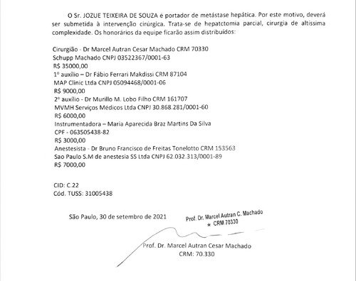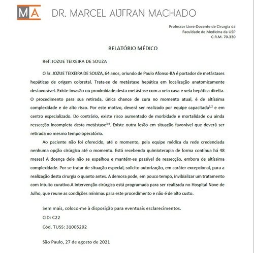 Meu pai mora em Paulo Afonso/BA e em 2016 foi diagnosticado com metástase hepática, após diagnostico o relatório médico apontou que existe invasão ou proximidade desta metástase com a veia cava e veia hepática direita, sendo assim, faz-se necessário realizar uma cirurgia. Apesar de realizar sessões de quimioterapia desde o diagnostico elas servem apenas como paliativo, o procedimento para a retirada da metástase é a única chance de cura. Por sua complexidade a intervenção deve ser realizada em São Paulo/SP no Hospital Nove de Julho, que reúne as condições mínimas para este procedimento. Essa cirurgia deveria ter sido realizada desde o seu diagnostico, por isso, estamos correndo contra o tempo para salvar sua vida.
