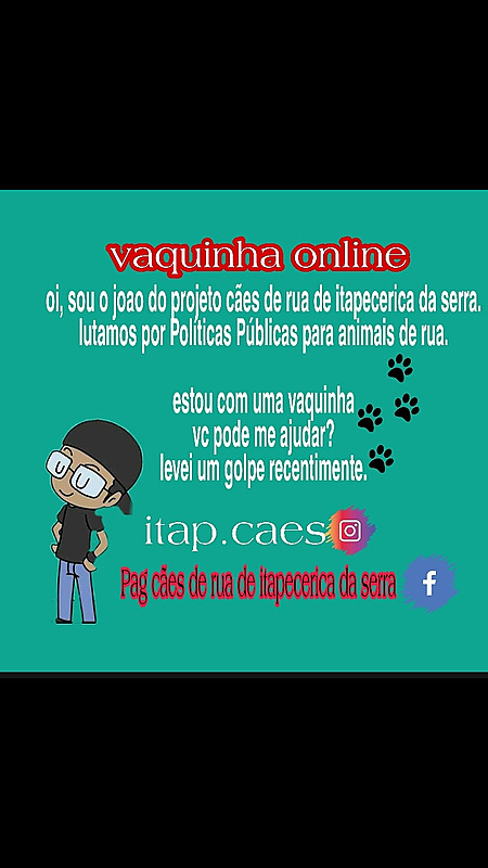 Olá, tudo bem? Bom, é muito raro eu fazer qualquer postagem aqui no Facebook, até mesmo entrar nessa rede social, e, eu sei que muitas vezes o pessoal vê esse link da Vakinha e nem lê, mas se eu estou compartilhando e pedindo para você ajudar ou divulgar é para uma boa causa. Nesta semana um dos meus melhores amigos João Silva, sofreu um golpe, e levaram todo o dinheiro que ele tinha na conta, o qual ele juntou a vida toda, esse dinheiro era o que ele comprava o material para fazer os seus quadros e bottons, sustentava a casa dele, a mãe e parte do seu projeto social para os 'Cães de Rua de Itapecerica da Serra - SP'. Quem anda pelo centro de Itapecerica com certeza já viu em muitos pontos comedouros e bebedouros, pois bem, boa parte deles é o João que vai lá instala e abastece, mesmo em meio a pandemia ele não deixou de fazer o ""trabalho"" dele, e quem conhece ele com certeza já deve ter o visto de um lado para outro sempre com um saco de ração na mão ou pelas redes sociais divulgando coisas sobre a causa animal na cidade, e para quem o conhece mais intimamente, como eu, há uns 13 anos, sabe que ele é uma das pessoas mais simples e que apesar de todas as dificuldades que tem, faz de tudo para ajudar quem está a sua volta. Eu sei que esse dinheiro que foi levado não se trata apenas do sustento próprio, da família e de um projeto que é muito bonito (aliás, quantas pessoas só falam, né?) mas envolvem terceiros, sempre foi assim, por isso, se você conseguir colaborar com uma pequena quantia que seja, R$5,00, R$10,00, R$15,00 já ajuda ou se você poder divulgar ou conhece alguém que possa dar algum suporte jurídico a ele, já que o banco disse que não se responsabiliza em nada pelo golpe , todo apoio é bem-vindo. (Vou deixar a página dele marcada no post) Coisas ruins acontecem com pessoas maravilhosas, mas eu tenho certeza que a diferença está na união de quem está em volta, e eu espero que o meu amigo, essa pessoa incrível que é o João, consiga ter parte do dinheiro recuperada para ele continuar tocando a vida do jeito que sempre fez e fazendo o que muitos gostariam de fazer. Muito obrigada.