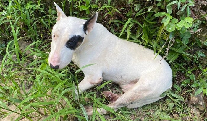 No dia 14 de abril saí para pedalar e me deparei com um olhar que pedia socorro. Este Bull Terrier foi encontrado abandonado em Blumenau, em um estado que parte o coração: sem água, comida, sem abrigo, rodeado de moscas e sem conseguir andar. Uma ferida grave, tomada por uma infestação de miíase (bicheira), consumia sua pata traseira.