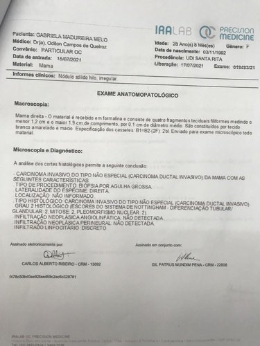 Sou a Gabi, descobri o câncer de mama após exames de rotina e a confirmação foi por biópsia em 17/07/2021. Devido à várias burocracias do SUS fui operada (mastectomia) somente em 13/10/2021 quase 3 meses depois.