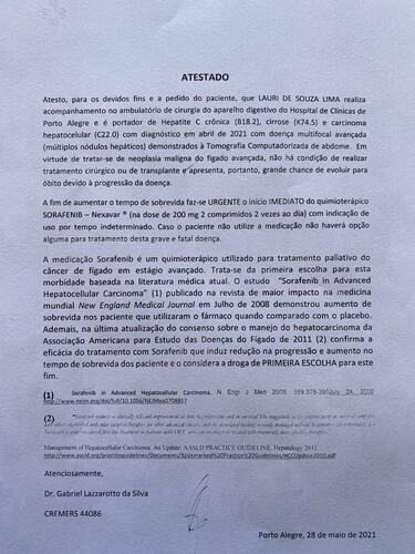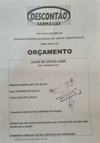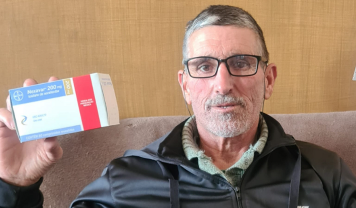 Meu irmão Lauri foi diagnosticado com Hepatocarcinoma (tumor altamente maligno) a expectativa de vida para pessoas com esse câncer é de 8 meses e para aumentar sua sobrevida, necessita com urgência fazer uso de NAXAVAR 200mg (tosilato de sorafenibe) duas vezes ao dia.