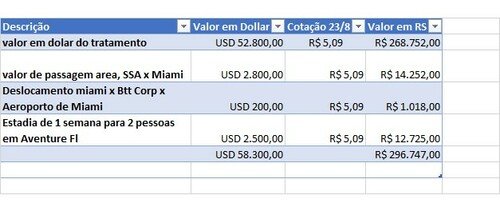 O custo orçado para o tratamento tendo como base os preços do dia 23/08/2022, são: