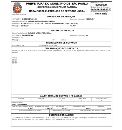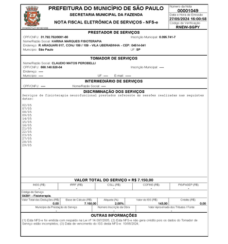 Abaixo as Notas Ficais dos atendimentos na clinica de fisioterapia nos meses de Abril e Maio: