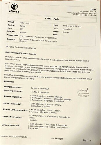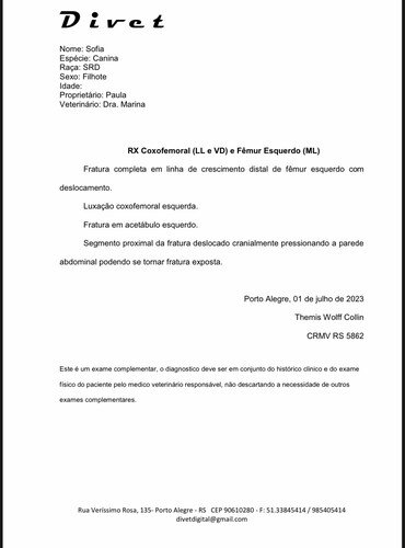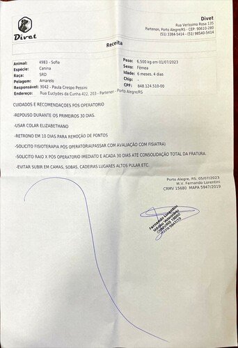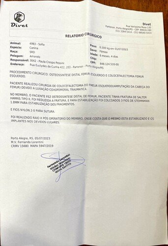 No dia 03/07 tive uma consulta com o veterinário ortopedista e ele disse que aquele dodói não era uma fratura de atropelamento, e sim de ESPANCAMENTO. Ele também falou que eu precisaria fazer uma cirurgia para colocar implantes no ossinho da minha patinha e para a amputação da cabeça do fêmur. A tia que me resgatou perguntou ao ortopedista se eu ficaria com algum problema de mobilidade e ele disse que não devo ficar, mas que o ideal é eu fazer fisioterapia pós operatória.
