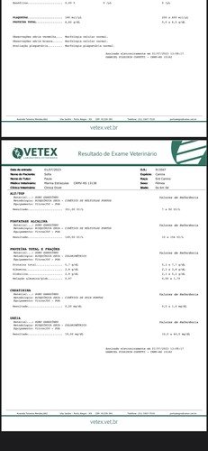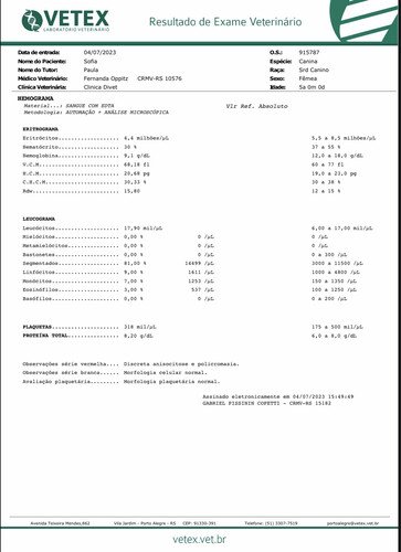 A primeira tia veterinária que me avaliou no dia 01/07, verificou através de exames de raio-x que eu estava com uma fratura muito feia na minha patinha traseira e disse que eu estava com muita dor. Ela falou que eu teria que ficar internada para tomar medicação e possivelmente realizar uma cirurgia na patinha. Além disso, com o resultado do exame de sangue, foi constatado que eu estava com anemia e alterações hepáticas.