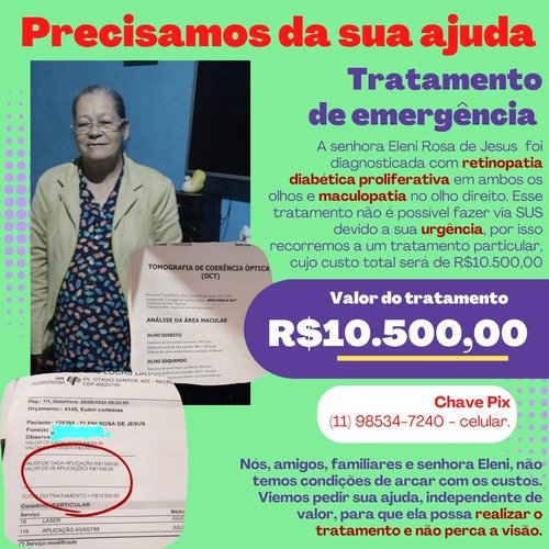 Nós, amigos, familiares e senhora Eleni não temos condições de arcar com os custos. Viemos pedir sua ajuda, independente de valor, para que ela possa realizar o tratamento e não perca a visão.