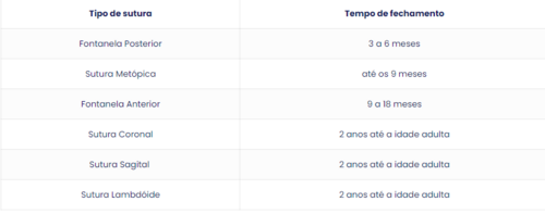 As suturas são os espacinhos entre os ossos cranianos, os ossos não são flexíveis, no entanto, as suturas vão fechando com o tempo. Isso, por natureza, ocorre para facilitar a passagem do bebê na hora do parto.