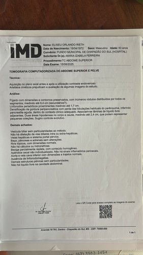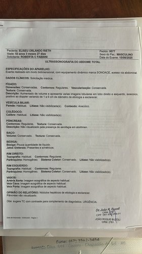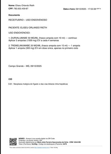 O Eliseu passou mal pela primeira vez em 15/08/2025, e desde então estavámos fazendo varios exames em Campo Grande MS para saber o que ele tinha, desde o inicio a suspeita foi cancer, porém houve divergencia nos resultados dos exames e ele precisou refazer tudo novamente. Até que decidimos transferir ele para Barreros e refazer todos os exames novamente lá, e no dia 08/12/2025 ficou confirmado que ele esta com um CARCINOMA HEPATOCELULAR grau IV o qual já se tornou metastico no pancreas e pulmão. Diante da gravidade do diagnostico, os médicos de Barretos recomendaram a imunoterapia para iniciar o mais rapido possível. Porém esta imunoterapia não tem disponivel no SUS.