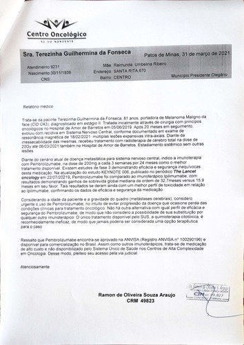 Ingressamos na justiça para a obtenção junto ao INSS as demais doses para todo o tratamento que pode perdurar por 24 meses.