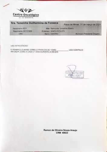 Este tratamento é realizado através do medicamento Pembrolizumabe (Keytruda), comercializada pelo laboratório Merck, com o valor de aproximadamente R$13.765,25 por dose.