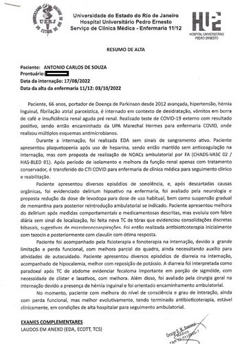 Recentemente ele precisou ser internado na UPA de Marechal Hermes, em 17/08/2022 sem consciência, forte infecção urinária, vômito com sangue e desmaios. Foi transferido para o Hospital Pedro Ernesto devido à gravidade do seu quadro. Positivou covid, foi mantido em isolamento, utilizando as sondas nasoenteral e vesical.