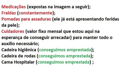 Abaixo segue com riqueza de informações o quadro que ele se encontra atualmente em casa, com necessidades de cuidados permanentes.