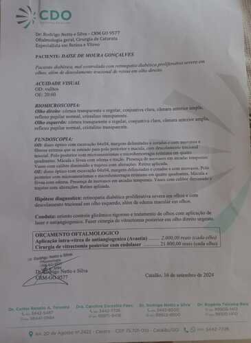 Há pouco mais de 1 mês, fui diagnosticada com Retinopatia Diabética (descolamento da retina nos dois olhos), e estou perdendo a visão. O olho direito está totalmente comprometido, restando apenas 5% de visão, e o olho esquerdo afetado com pouco mais de 50%.Estou na fila do SUS pelo mesmo tempo de diagnóstico, e não tenho muito tempo para poder reverter minha situação e não chegar a cegueira! O Custo do meu tratamento está em torno de 60.000,00 (sessenta mil reais), porém não tenho condições de pagar por ele, nesse intuito criei essa vaquinha para que, com a ajuda de vocês, eu possa conseguir custear os gastos com meu tratamento o mais rápido possível, já que o médico me deu apenas 3 meses para realizar o tratamento antes que eu perca totalmente a visão. Gostaria de poder contar com a solidariedade de quem puder ajudar.
