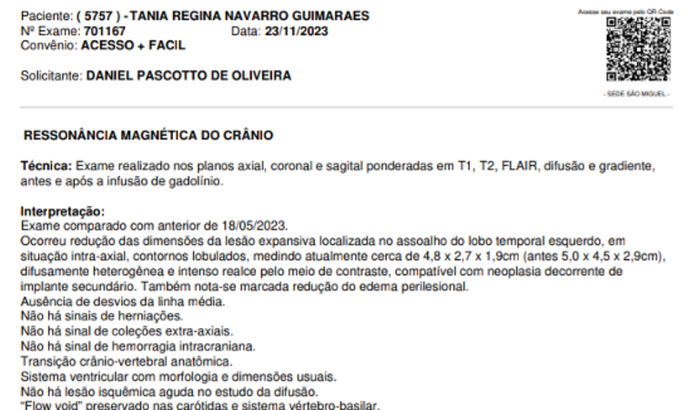 Olá, minha mãe superou um câncer de mama, em que realizou duas cirurgias e removeu a mama, hoje se encontra curada do tumor na mama, mas que infelizmente ocorreu metástase para o lobo temporal esquerdo do cérebro, causando empecilhos na qualidade de vida, como fala, memória, etc. O destino do dinheiro arrecadado é para os gastos no tratamento urgente e nas viagens que precisam ser realizadas a cada consulta.