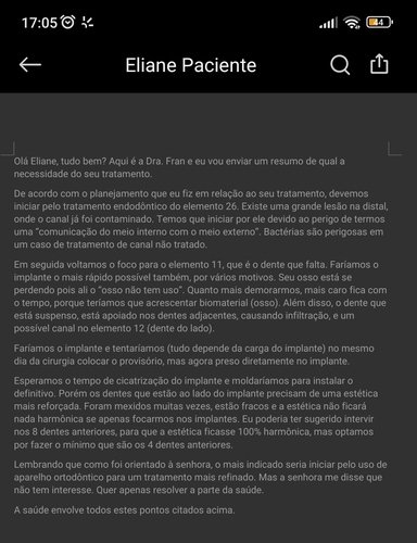 "Olá Eliane, tudo bem? Aqui é a Dra. Fran e eu vou enviar um resumo de qual a necessidade do seu tratamento.De acordo com o planejamento que eu fiz em relação ao seu tratamento, devemos iniciar pelo tratamento endodôntico do elemento 26. Existe uma grande lesão na distal, onde o canal já foi contaminado. Temos que iniciar por ele devido ao perigo de termos uma “comunicação do meio interno com o meio externo”. Bactérias são perigosas em um caso de tratamento de canal não tratado.Em seguida voltamos o foco para o elemento 11, que é o dente que falta. Faríamos o implante o mais rápido possível também, por vários motivos. Seu osso está se perdendo pois ali o “osso não tem uso”. Quanto mais demorarmos, mais caro fica com o tempo, porque teríamos que acrescentar biomaterial (osso). Além disso, o dente que está suspenso, está apoiado nos dentes adjacentes, causando infiltração, e um possível canal no elemento 12 (dente do lado).Faríamos o implante e tentaríamos (tudo depende da carga do implante) no mesmo dia da cirurgia colocar o provisório, mas agora preso diretamente no implante.Esperamos o tempo de cicatrização do implante e moldaríamos para instalar o definitivo. Porém os dentes que estão ao lado do implante precisam de uma estética mais reforçada. Foram mexidos muitas vezes, estão fracos e a estética não ficará nada harmônica se apenas focarmos nos implantes. Eu poderia ter sugerido intervir nos 8 dentes anteriores, para que a estética ficasse 100% harmônica, mas optamos por fazer o mínimo que são os 4 dentes anteriores.Lembrando que como foi orientado à senhora, o mais indicado seria iniciar pelo uso de aparelho ortodôntico para um tratamento mais refinado. Mas a senhora me disse que não tem interesse. Quer apenas resolver a parte da saúde. A saúde envolve todos estes pontos citados acima."