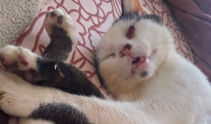 Um gatinho SRD, FIV/FELV positivo, fui abandonado pelos meus antigos tutores no condomínio que a humana mora. Eles me deixavam “dar voltinhas”, e numa dessas me perdi, voltei pra casa todo ferido, magrelo, e bem debilitado, e eles não me deixaram entrar.