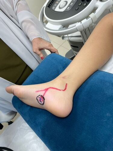 DOPPLER ESPECIALIZADO EM ANEXO INDICA LESÃO NODULAR SOLIDA OVALADA DE CONTORNOSREGULARES E HETEROGENIA MEDINDO 3,4 X 1,5X 2,1 AO REDOR DA LESÃO HA PERDA DAARQUITETURA MUSCULAR E LIPOSSUBSTITUICAO LOCALIZADO NA REGIÃO PLANTAR ADIREITAPRESENCA DE UMA RAMO ARTERIAL PROVENIENTE DA TP QUE SE ENTENDE ATE O BORDOINFERIOR DO NÓDULO E RAMIFICANDO-SE NO SEU INTERIOR AUSÊNCIA DE LAGOS VENOSO OUFLEBOLITOS .
