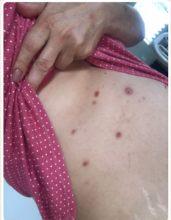 E em junho de 2022 apareceram estas petéquias no abdômem, e eu como sou Auxiliar de enfermagem há 26 anos e no atual momento trabalhava na Santa Casa de Itatiba na maternidade assustei com estas bolinhas que coçavam muito.