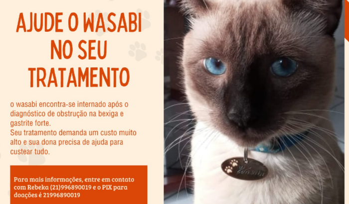 Estou fazendo a vaquinha devido ao caso dele estar grave, onde descobrimos que ele está com obstrução da bexiga e gastrite forte, não conseguindo comer, beber água ou fazer suas necessidades. Conseguimos arcar com os primeiros socorros, a desobstrução da bexiga, porém o caso ainda é crítico devido a bexiga dele está bem fininha e suas taxas de creatinina e uréia estão tão altas que os veterinários não entendem como ele ainda está vivo.