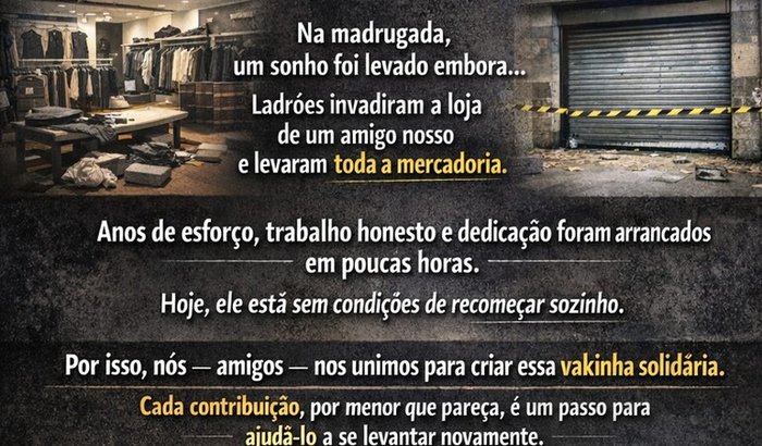 Olá,, sempre tive um sonho de ter meu próprio negócio. Graças a Deus, consegui realizar este sonho, porém 2 meses após abrir minha tão sonhada loja de roupas fui roubado. Pela manhã quando cheguei, a loja estava aberta e tinham levado tudo , até mesmo os cabides. Eu e minha esposa trabalhamos por muito tempo de dia e de noite inclusive nos finas de semana, para podermos realizar esse sonho e da noite para o dia perdemos tudo. Entrei em depressão pois tudo o que tinhamos estava ali. Peço humildemente se Deus tocar em seu coração e puder me ajudar a voltar realizar meu sonho de ter meu próprio negócio, nos ajude. PRECISAMOS DA SUA AJUDA! Que Deus abençoe.