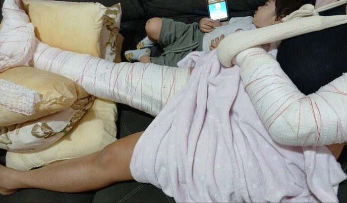 Hoje, eu estou com o braço esquerdo e a perna direita quebrados, além de escoriações pelo corpo. Não consigo me movimentar sozinha e preciso de ajuda até para tomar banho, levantar da cama ou cuidar das necessidades básicas.