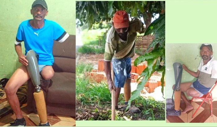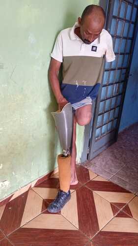 A prótese que ele utiliza atualmente quebrou há 2 anos. Hoje, esta prótese, além de machucar o corpo, se solta e cai com frequência enquanto ele trabalha. Ele só continua utilizando porque faz remendos improvisados. Sem uma prótese digna, o risco de uma queda grave aumenta a cada dia, o que tiraria dele a capacidade de prover para sua família.