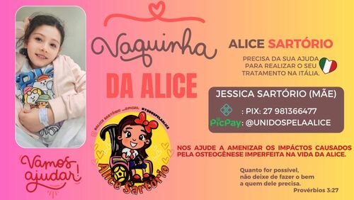 Alice é uma menina de 9 anos que nasceu com uma doença genética rara chamada osteogênese imperfeita, também conhecida como “doença dos ossos de vidro”. Alice tem deformidades ósseas e mais frágeis, estando suscetíveis a fraturas constantes.Desde cedo, Alice enfrentou muitas limitações devido à sua condição. Ela teve que lidar com fraturas frequentes e dores constantes. Além disso, ela tem articulações mais frouxas, dentes fracos, coloração azulada do branco dos olhos, curvatura anormal da coluna (escoliose), perda de audição, problemas respiratórios frequentes, além de epilepsia, urticária, deficiência no rim esquerdo, Bixiga aumentada e uma cardiopatia .Apesar de todas essas dificuldades, Alice é uma menina forte e determinada. Ela nunca desiste e sempre tenta superar suas limitações. No entanto, ela precisa de ajuda para conseguir o tratamento adequado para sua condição.Recentemente, descobrimos que existe um tratamento que pode ajudar a melhorar a qualidade de vida de Alice, reduzindo o risco e a frequência das fraturas. Infelizmente, o tratamento é muito caro e não podemos arcar com os custos sozinhos.Por isso, contamos com a colaboração de todos, para que Alice consiga o tratamento na Itália. Qualquer valor é bem-vindo e fará uma grande diferença na vida dessa menina incrível. Juntos, podemos ajudar Alice a ter uma vida melhor e mais feliz. Por favor, nos ajude a conseguir o tratamento que ela precisa .