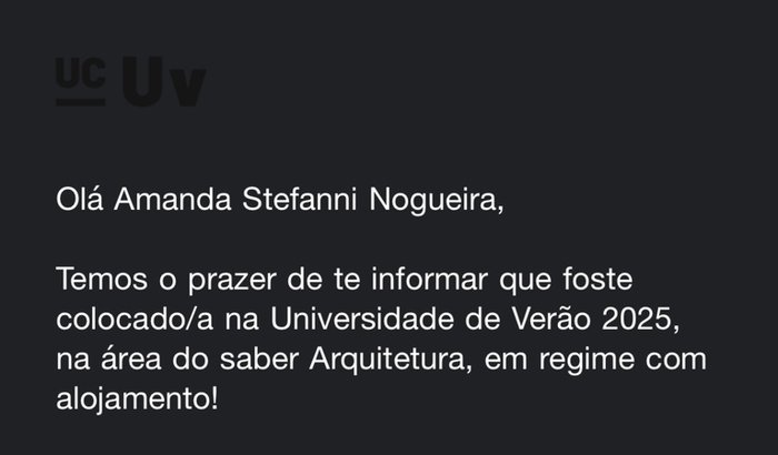 Oiii eu sou a Amanda, tenho 16 anos e passei em um programa de verão sobre arquitetura na Universidade de Coimbra, em Portugal.