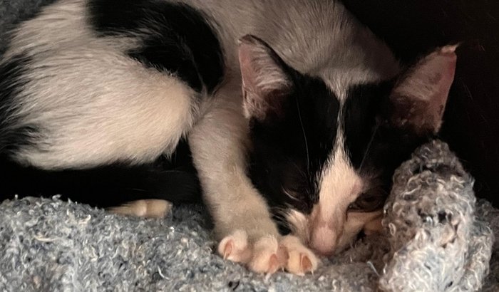 Ele estava muito assustado e miando bastante. Levamos para casa, alimentamos e demos carinho. Após uma avaliação no Hospital Veterinário Santa Catarina, ele foi medicado para pulgas e recebeu suplementos, mas aparentemente está tudo bem. Ele tem cerca de 3 meses e decidimos batizá-lo de Molotov, dada a sua natureza corajosa e 'explosiva'.