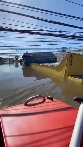 Foto da nossa rua Vidal Barbosa/Sarandi POA na esquina em amarelo se encontra o mercado Grenal ficou somente o telhado do mercado aparente. Observe que somente as casas com 2 andares da rua não foram cobertas pela água. Nossa casa era térrea no final da rua.