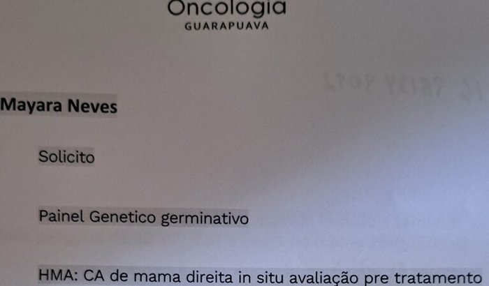 Me chamo Mayara, tenho 34 anos e a poucos dias fui diagnosticada com “Carcinoma ductal In situ”. Um tumor maligno na mama, que necessita avaliação do painel genético gernimativo para prosseguir com o tratamento, oque consiste na cirurgia de Mastectomia unilateral ou bilateral, dependendo do resultado da mutação genética encontrada no exame. No Paraná esse exame custa entre R$2.000,00 a R$4.000,00. O SUS não oferece amplamente exames de painel genético germinativo para rastreamento de predisposição a câncer ou outras doenças hereditárias, e devido ao alto custo, pouquissimas pessoas tem condições de realiza-lo. Por isso, conto com a ajuda de vocês!