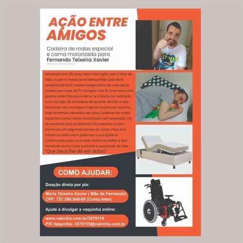 Fernando tem 39 anos, teve meningite com 2 dias de vida, e com 6 meses teve hidrocefalia ( paralisia cerebral parcial), nesses longos anos de vida ele já passou por mais de 15 cirurgias. Aos 16 anos teve uma queda, onde fraturou o fêmur e a bacia, foi realizado uma cirurgia de Artrodese de quadril, devido a isso Fernando não consegue se locomover sozinho. Hoje Fernando necessita de uma Cadeiras de rodas especial para o caso especifico dele, uma Cama motorizada com elevação por conta da circulação e fraldas. Ele se encontra com problemas circulatórios e com trombose em algumas partes do corpo.Seu Pai Márcio é o único que trabalha na casa, sua mãe Maria Aparecida é dona do lar e cuidadora integral do Fernando. Maria Aparecida sua mãe enfrenta também problemas de saúde. Ela é diabética grau 3, e sofre de problemas no coração (Angina) isso dificulta muito no dia a dia, ela nao pode fazer esforços fisicos entre outras Restrições. Mas como mãe, ela precisa fazer muito mais que esforços fisicos diariamente.Fernando também necessita fazer fisioterapias diárias, e atualmente faz somente 1 vez na semana pelo estado. Fernando usa fraldas, e ganha atualmente 100 frandas ao mês da Prefeitura, mais sendo adulto acaba em 15 dias. Ele faz uso de medicamentos diários, 1 desses medicamentos custa R$300,00 /mês, fora os outros. Para isso iniciamos está luta e pedimos a sua ajuda e colaboração para que esse sonho se realize e que Fernando tenha mais conforto e qualidade de vida.