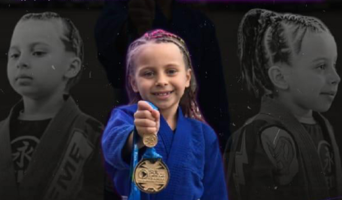 Eu sou a Valentina Lopes, tenho 7 anos, sou competidora de Jiu-jítsu.