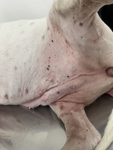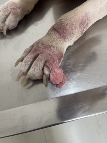 Apelidamos ela de Malandra, tem aproximadamente 7 anos, é extremamente dócil e carinhosa. Tomou banho, remédio antipulga/carrapato, vermífugo e outras medicações. Está com inflamação na pele e ouvidos, além dos tumores. Estamos preparando tudo para conseguir realizar a cirurgia, esperando que ela fique melhor e não tenha mais dor.