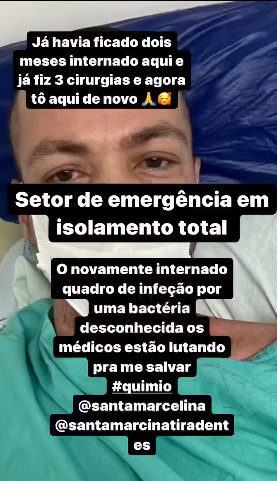 Quando sai do hospital descobriram o câncer eu luto fazendo químio no Emílio Ribas de 15 em 15 dias Por isso não tenho imunidade e agora peguei a bactéria que os médicos não sabem o que eh e agora apareceu um caroço no pescoço vou fazer biopicia devido a tudo isso estou internado em setor de emergência em isolamento sobe antibióticos na veia. Tudo começou no fim do ano passado c apêndice estourada fiquei entre a vida e a morte durante dois meses de internação.Eu só queria uma chance de vencer isso tudo 💕🙏🙏”
